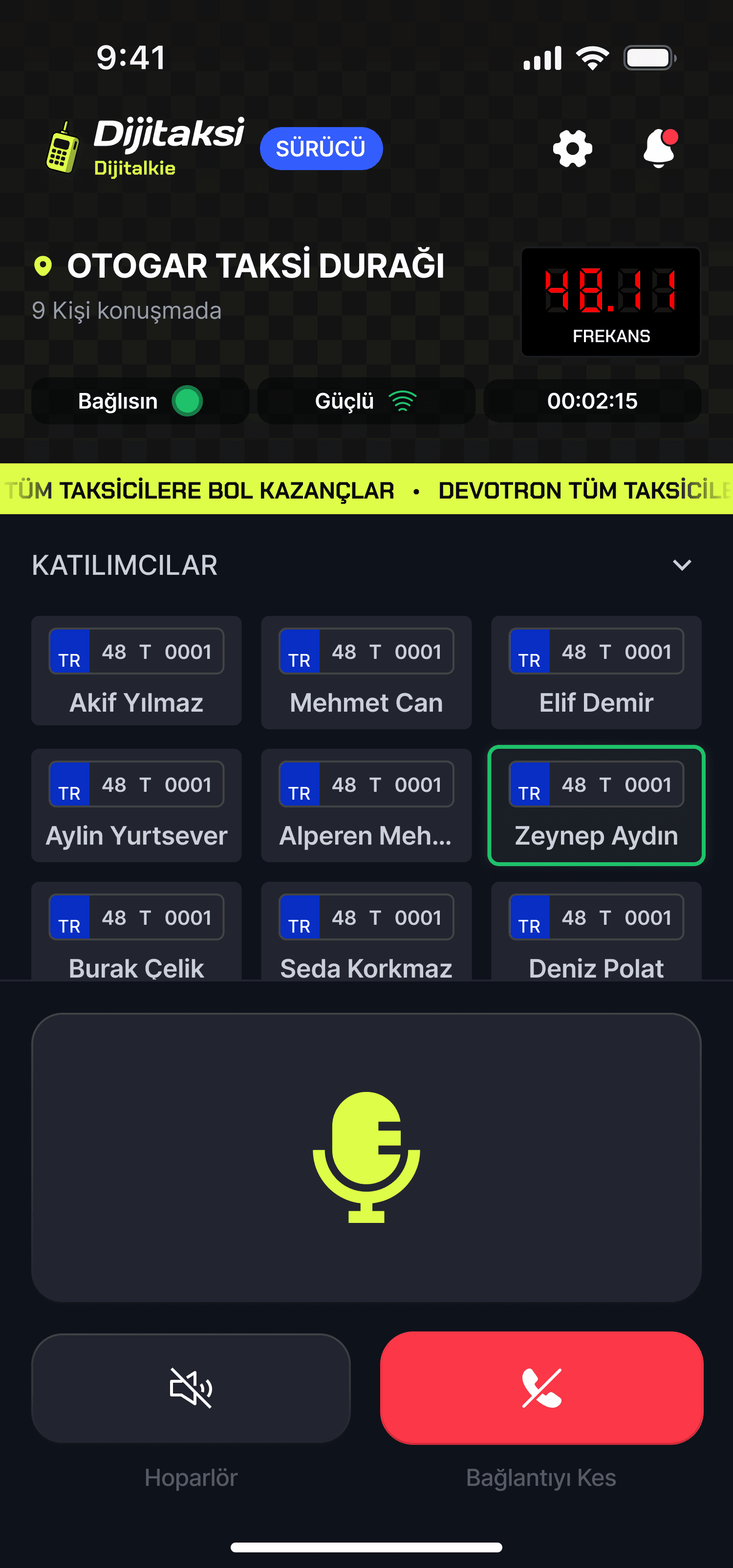 Durağınızdaki tüm şoförlerle anında iletişim kurun; frekansta herkes sizi duysun.